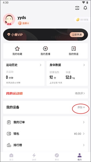 2、在个人中心页面中找到“我的设备”模块,点击右侧的添加按钮。