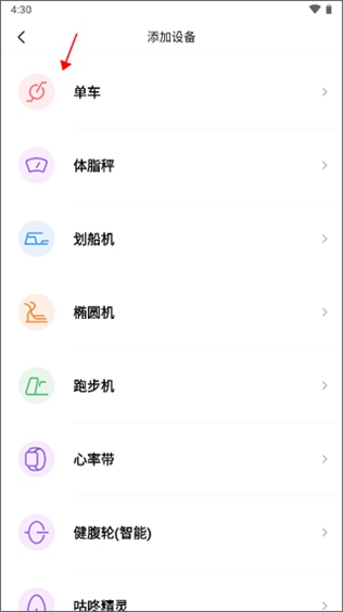 3、进入设备列表后,可以看到多种设备选项,选择单车。