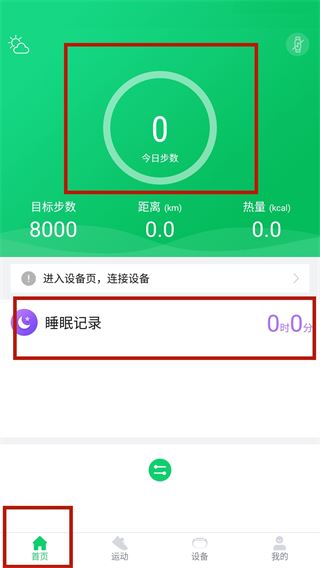 4、在首页中可以查看当天的步数信息,并进行睡眠记录。
