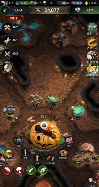 蚁巢区域解锁条件:若想探索更多蚁巢区域,除了提高蚁后的等级外,还需要收集大量资源并增加仓库的储存容量。这两个条件是相辅相成的。要解锁更多区域,你必须获得足够的资源。完成新手引导后,玩家的主要任务便转向提升蚁后的等级,因此收集肉、植物、水、沙子和蜜露等资源成为日常目标。